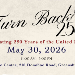 Turn Back 250 Special Event Come celebrate 250 Years of the United States at Donohoe ... 30 May 11:00 am - 3:00 pm Westmoreland Conservation District218 Donohoe Road, Greensburg, PA 15601